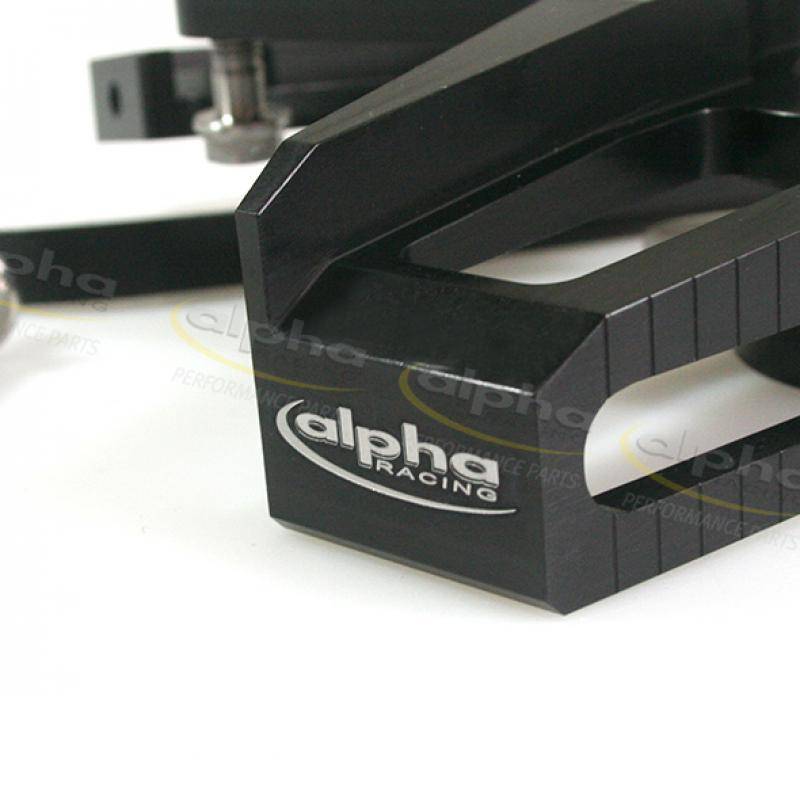 Chain adjuster kit SBK, for brake caliper to be mounted below swing arm, for Brembo P4 (3421A004A00), hole distance 64mm, integrated wheel sensor adaptor (OEM), 2 chain adjuster bolts, titanum screws for caliper mounting, CNC machined, black anodised with alpha Racing logo, fits OEM swing arm
