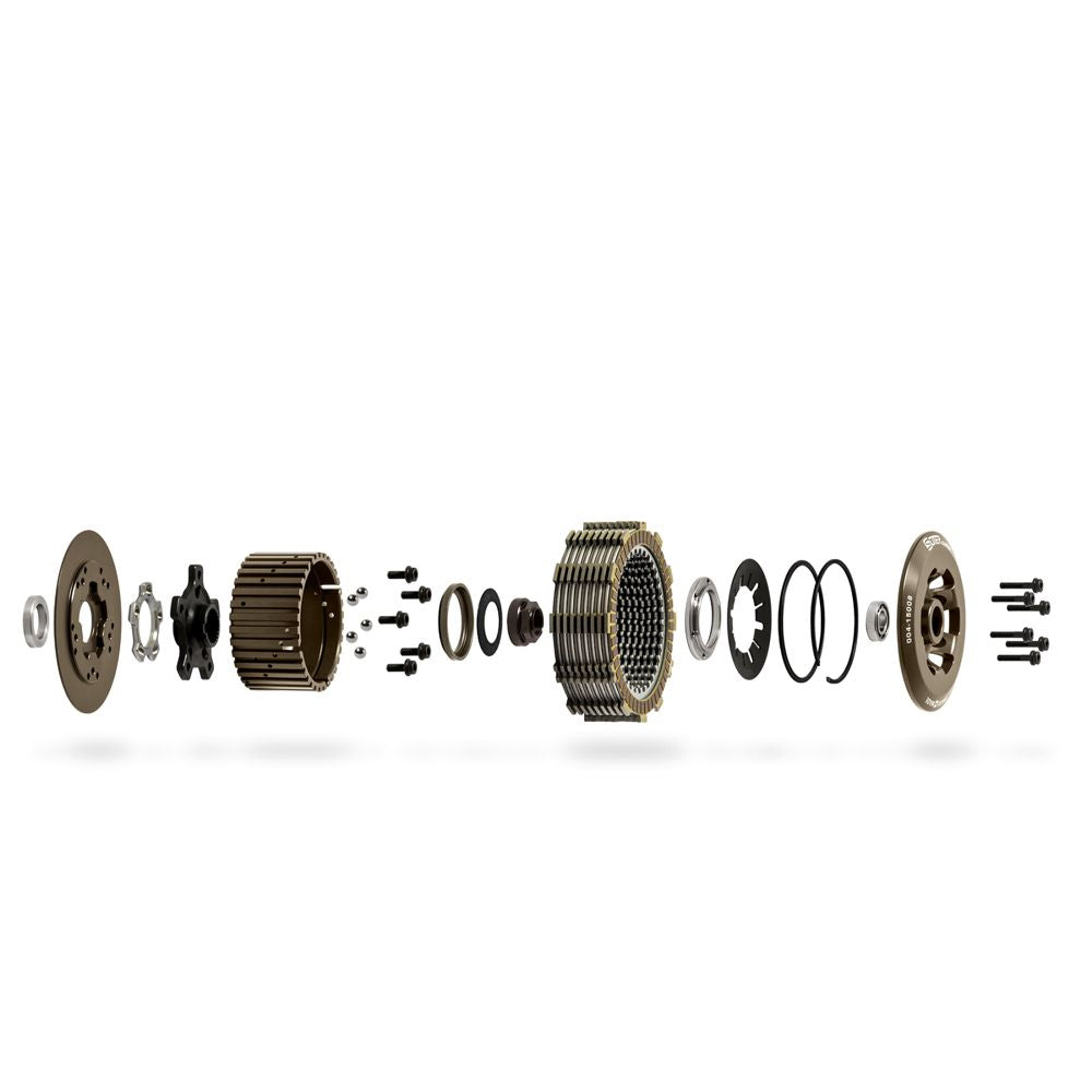 The BTL (Back Torque Limiter) SuterClutch was specifically developed to improve lap times while reducing the physical effort required by the rider. It can be simply and easily adjusted to different conditions and rider styles. It reduces the strain on all components including the gearbox, prevents over-revving of the engine and maximizes the suspension performance.