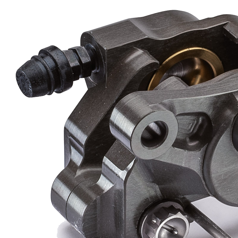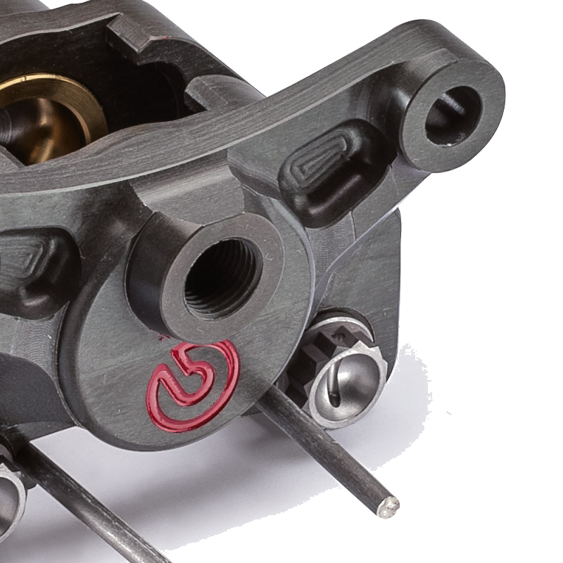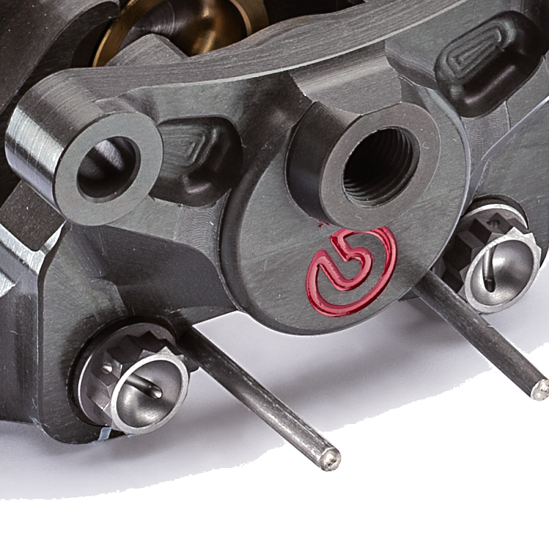 2-Piece , 64mm Mount Spacing, Rear, Hard Anodized It is a small and extremely lightweight racing caliper designed specifically for riders who use the rear brake moderately. This caliper is in two pieces and is made entirely from billet. This machining, which uses sophisticated numerically controlled equipment, provides maximum stiffness and lightweight values which are reflected in its absolutely excellent performance. Inside it houses two 24 mm diameter pistons. The caliper should be hand mounted and the screw tightening torque should be objectivated. To be mounted this caliper requires a specific adaptor bracket. This caliper is used with excellent performance on all Super Sport bikes and racing bikes such as those raced in Moto2, Moto3 and MotoGP. It has also become increasingly popular in Southeast Asia where it is used as a front brake in “underbone” category competitions where the engine is positioned under the frame. Questa pinza richiede l'utilizzo di un disco posteriore con fascia frenante da 24 mm. This Component is designed and manufactured to be used exclusively in racing competitions and, therefore, the product shall be installed through specific adaptors not included in the packaging of the component and by highly qualified and competent professionals working in the “racing” field. Please contact our distributor for any further clarification.