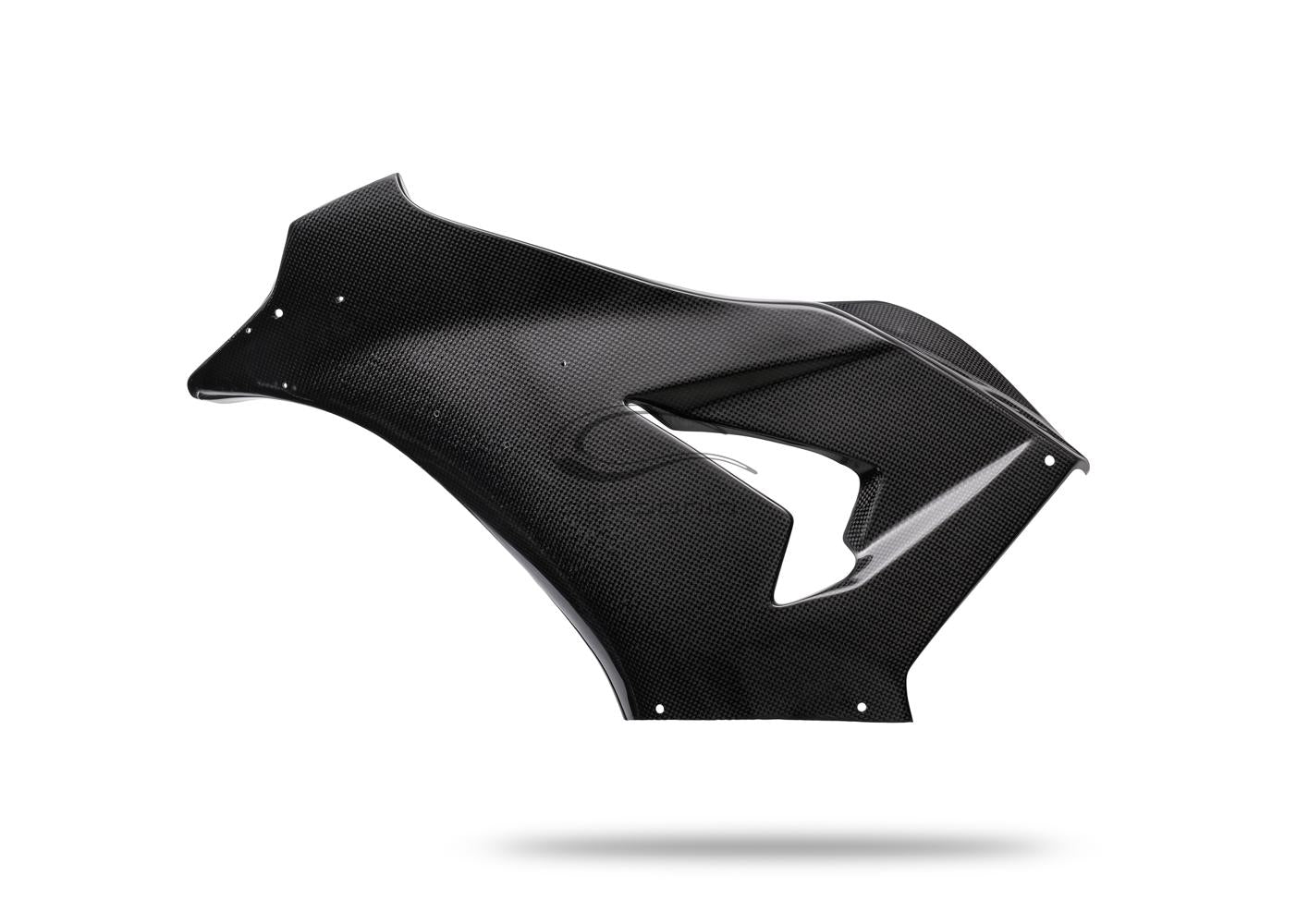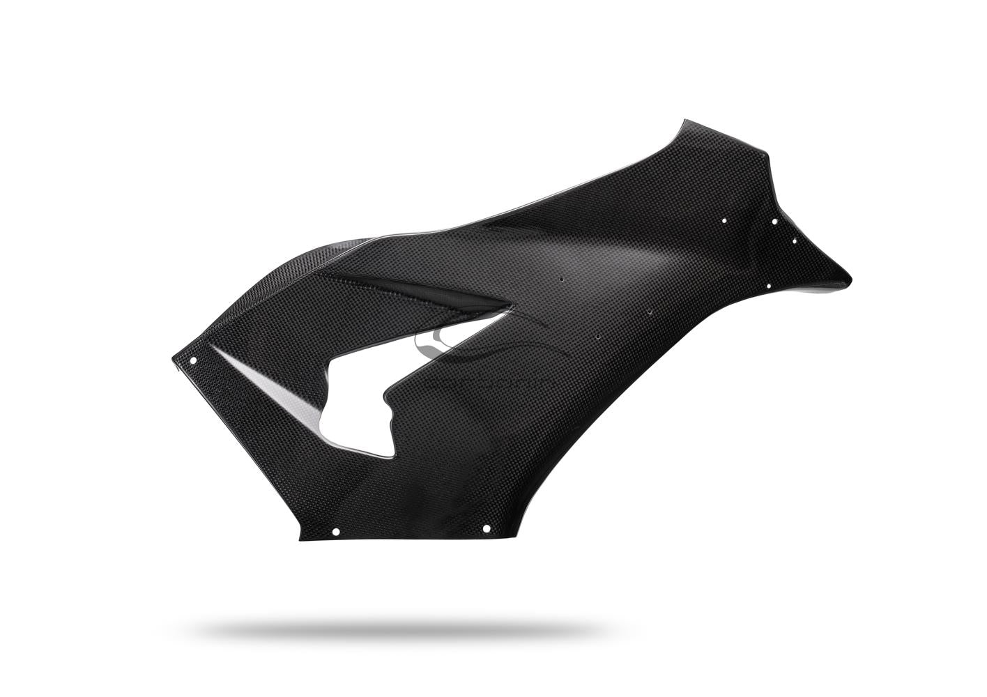 Carbon Fiber Fairings made with Plane weave carbon finished in a Gloss shine pre-pregnated carbon fiber on the inside. They are Vacuum bagged and cured in an autoclave with special techniques developed over years of perfecting the art making them to the highest standards required by professional race teams for perfect fitment and ease of removal and installation. These fairings save time installing because they come with all the Dzus fasteners pre-installed and the bodywork holes drilled (uppers are left undrilled at the fairing bracket because different aftermarket options for fairing brackets are available). Some models secure to the OEM fairing bracket via the screen holes. Carbonin work in development with teams such as BMW Motorrad WSBK ,YART Yamaha Austria Racing Team and Honda Racing UK