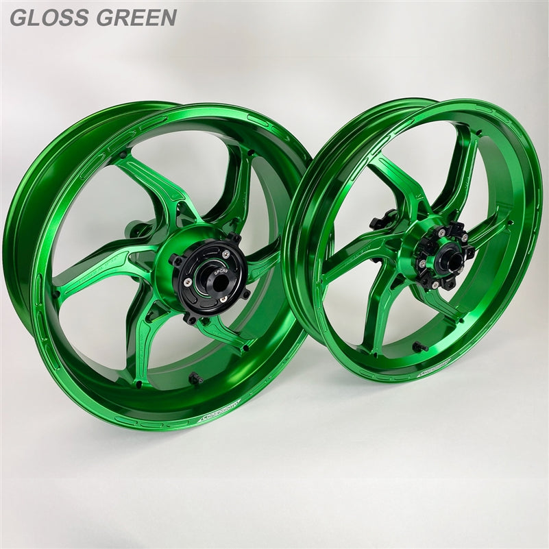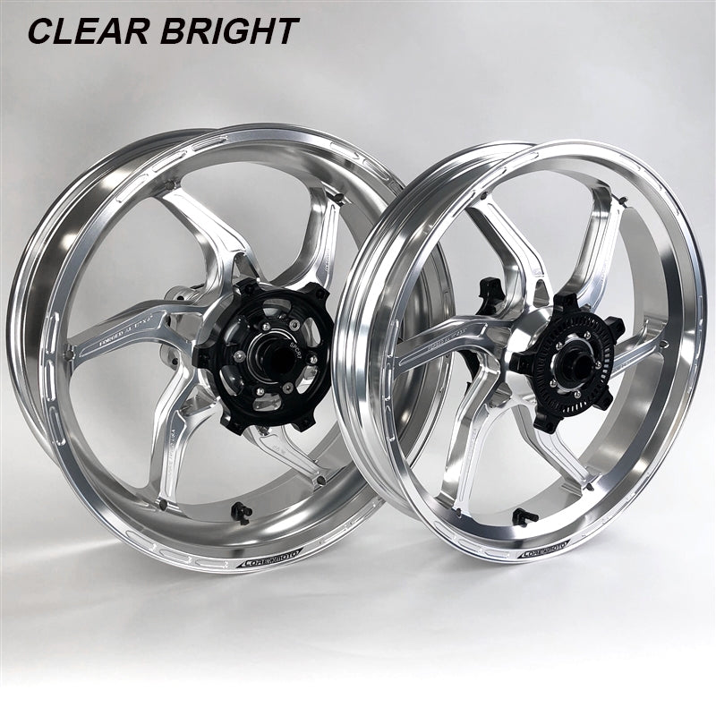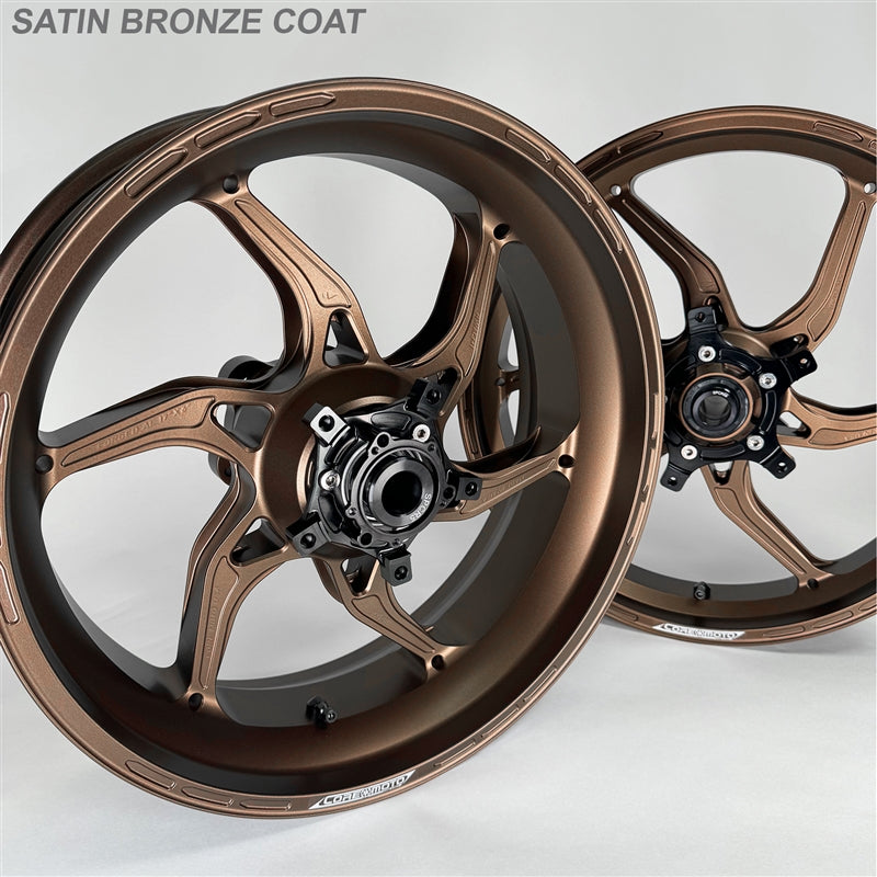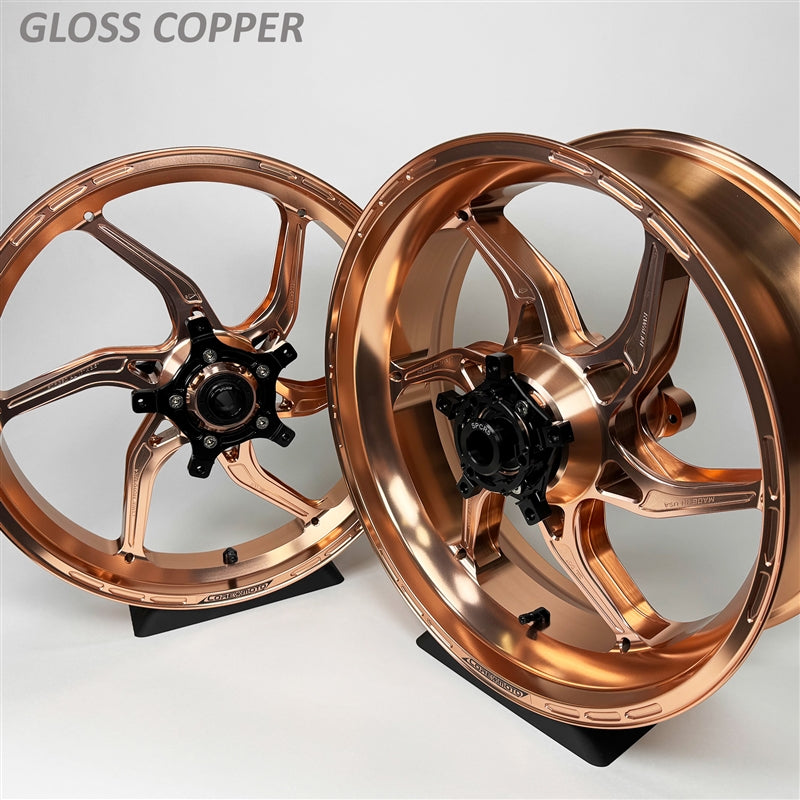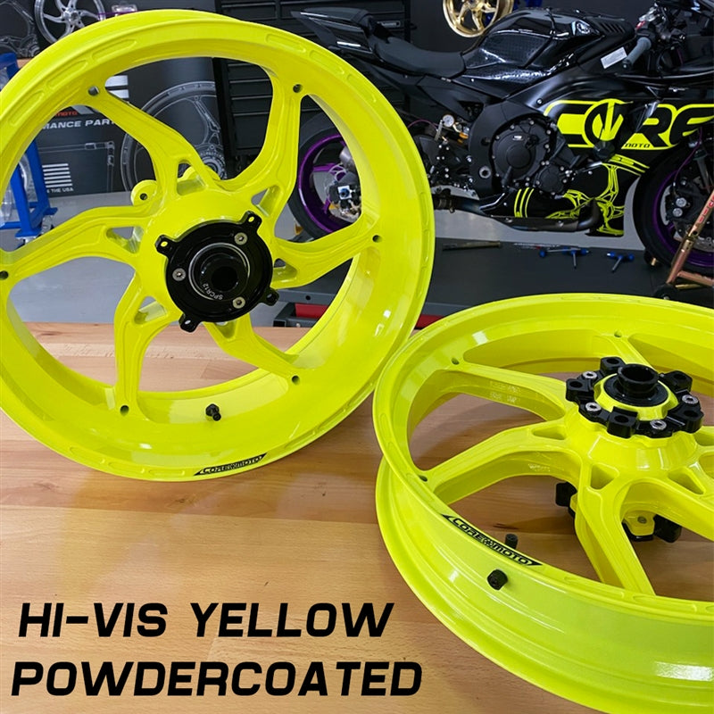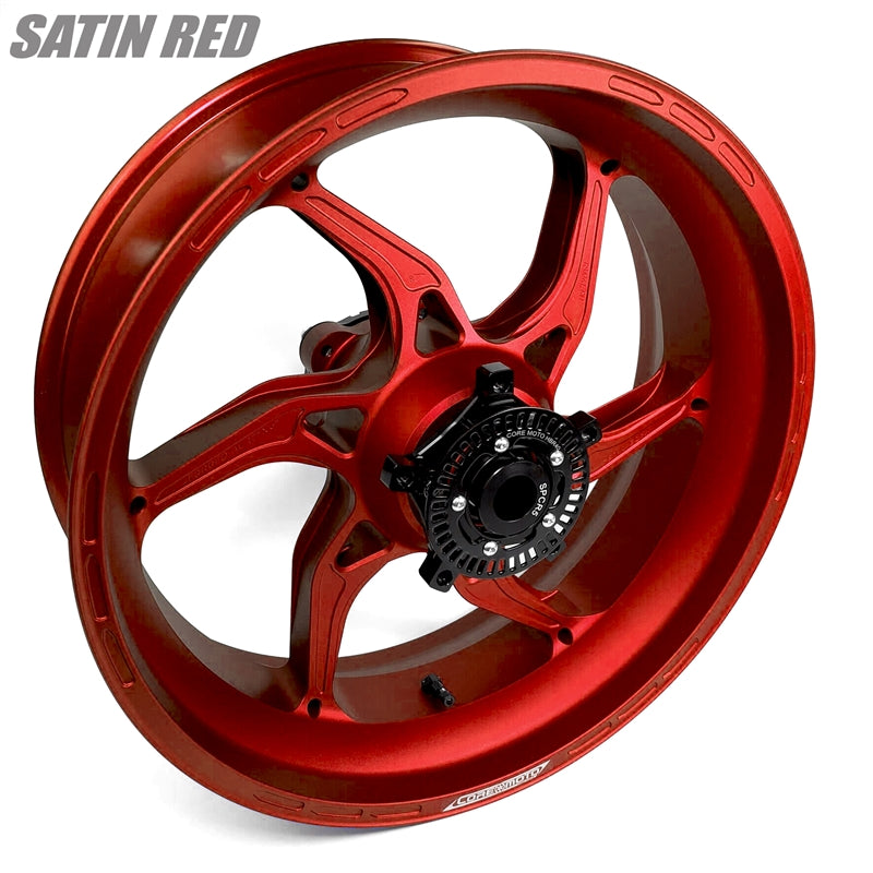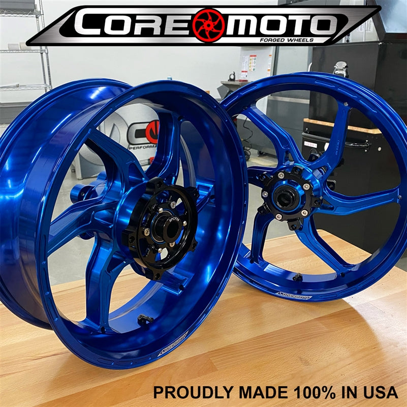 CAD Designed, one piece, proprietary Forged monolithic hub design. Core Moto makes true forged wheels, purpose built for performance. Rather than using market available generic forged blanks, Core Moto wheel forgings are made specific to each model we offer from proprietary forging dies. Although a custom forging limits the amount of sizes we can offer, it nets a superior product overall due to optimized grain flow properties. Each wheel starts out as an aluminum billet that does not resemble a wheel. This Billet is then heated and formed by a 6000 ton controlled Hydraulic constant pressure forge to create the central hub and spoke profile with optimized grain flow. Next a cold spin process is used to form the strong and light rim section. This creates the basic shape of the wheel profile with a non linier grain that instead flows to match the profile of the wheel. This process is highly controlled to distribute the grain of the metal in a way that optimizes the strength of the wheel on a molecular level, thus requiring less material (weight) needed in the final product. Constant pressure forging creates a more controlled and repeatable product than traditional drop forging.. Core Moto wheels are not drop forged. After forging, the near net forged blanks are heat treated, turned and milled by 3 and 5 Axis CNC machines in the USA with carbide and diamond cutting tools to remove material and give the wheel its final shape.