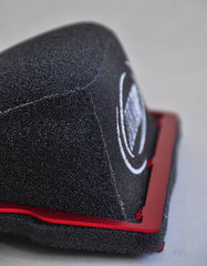 More / bigger surface area means less restriction and better protection, but the real secret of the new WSBK filters is that it uses two different kinds of foam materials. The part where the logo is printed is foam material used for our roadbikes (more dense), the rest is the foam material for the full racefilters (less dense), placed to create the same effect as the splitter-plate on the “HE” & “R” filters.