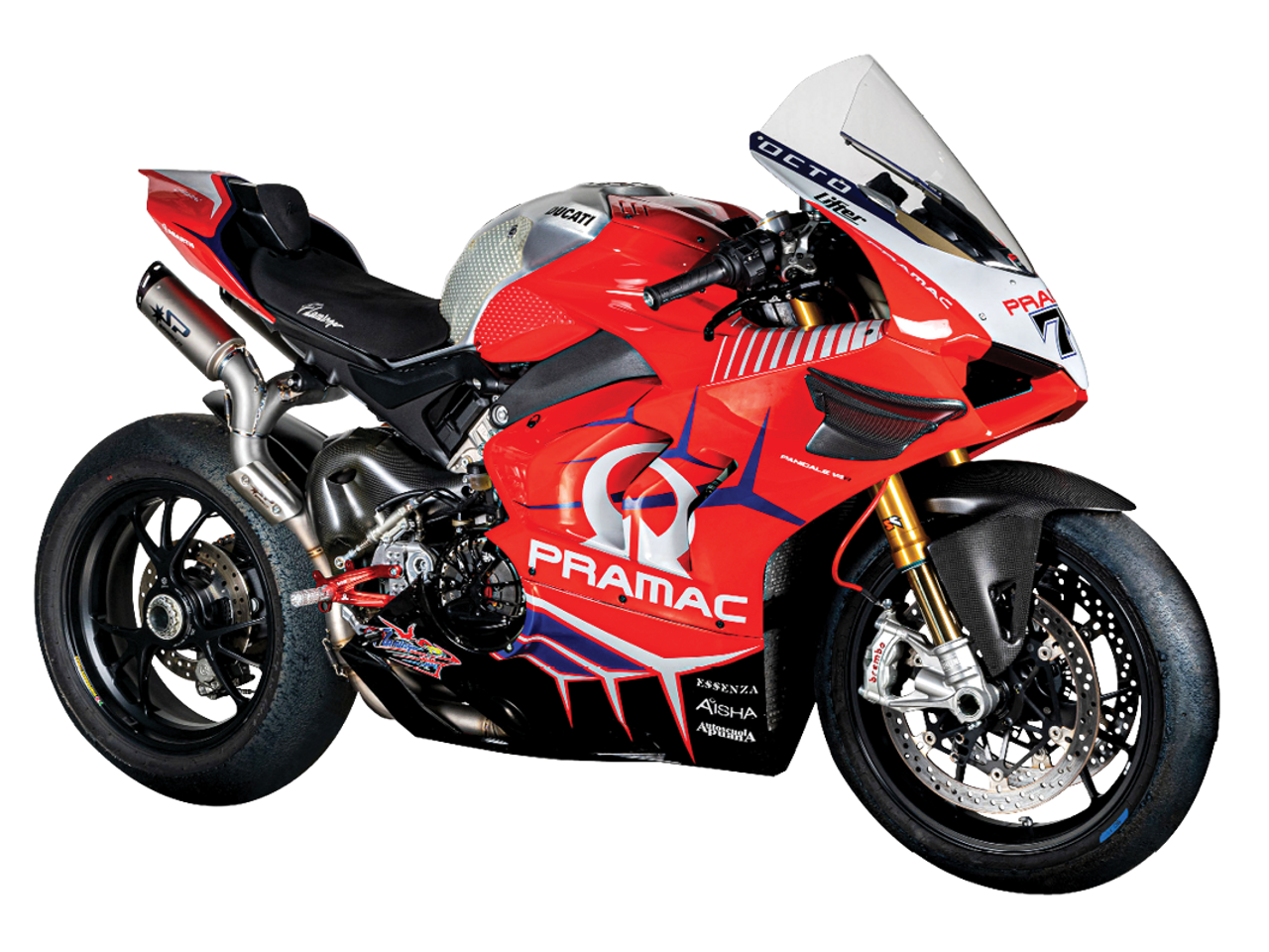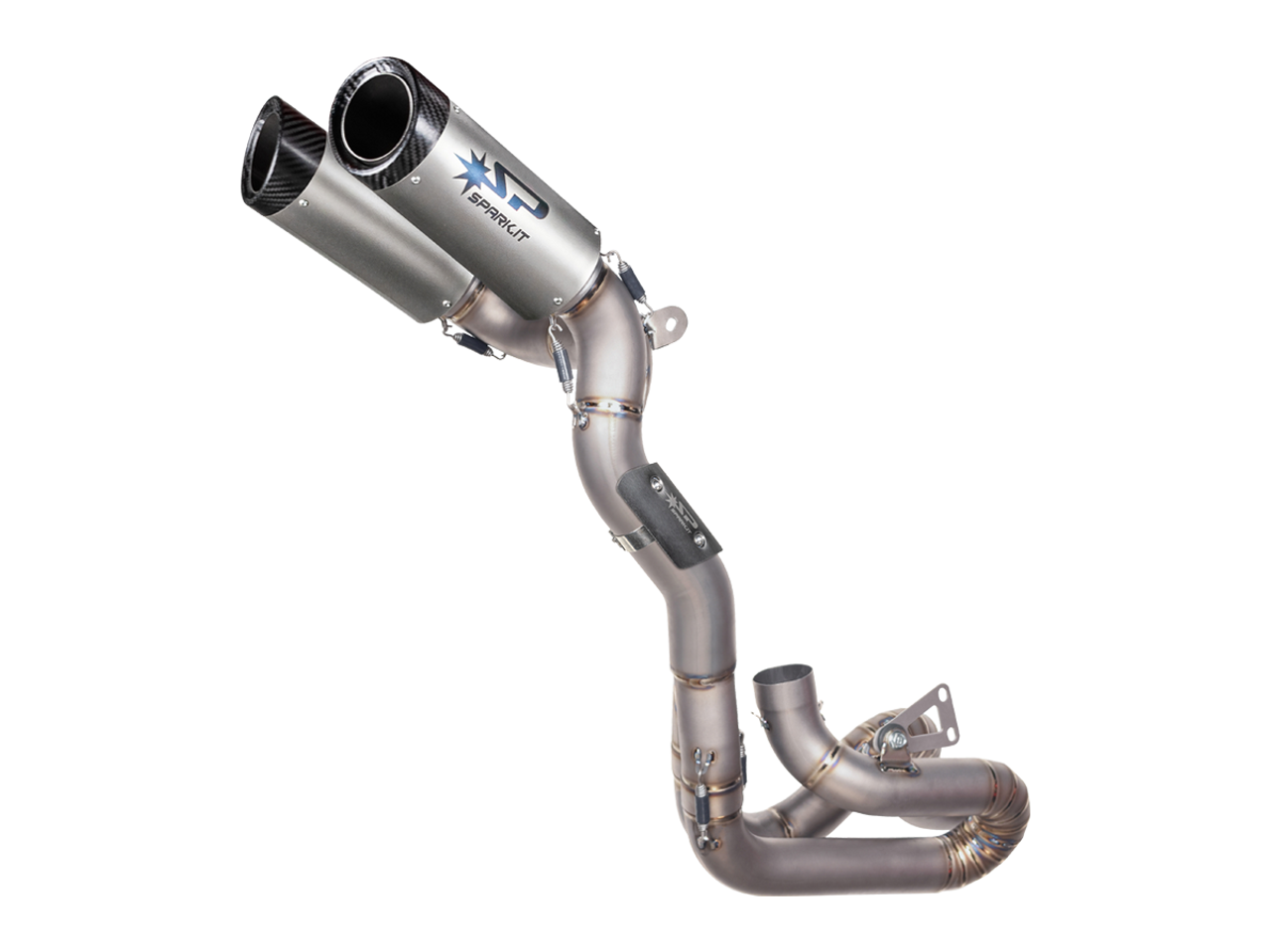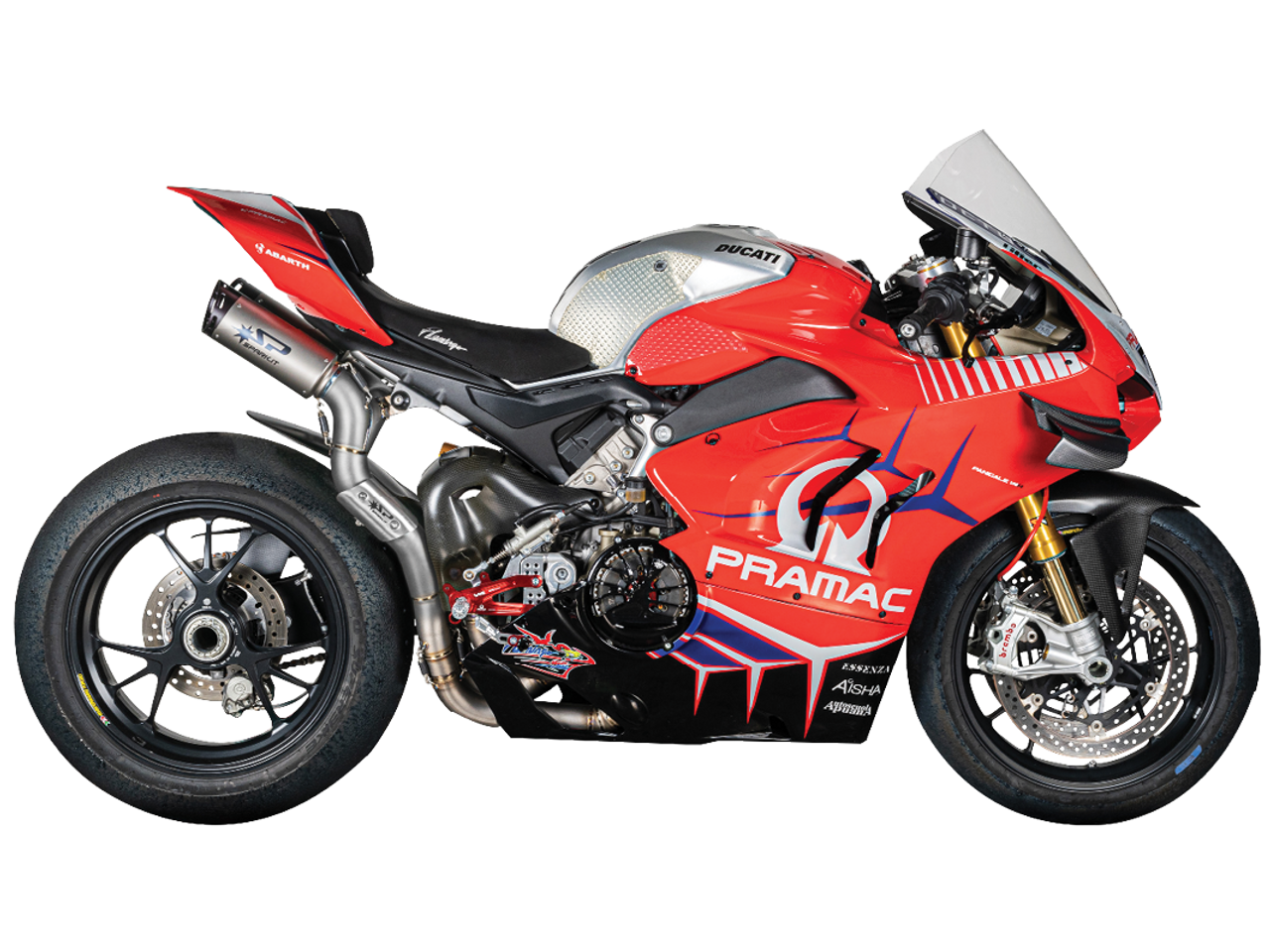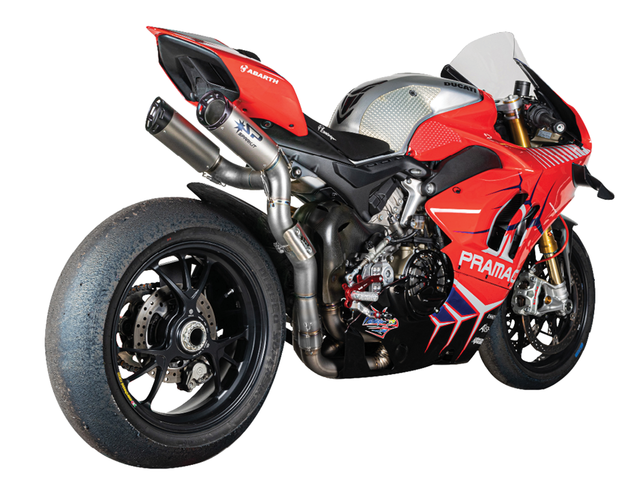 Spark Exhaust Ducati Panigale V4 S/R (-2024) and Streetfighter V4 S (Single Sided Swingarm Rear) "Double Dyno" Titanium / Inconel Semi-Full Exhaust System (WSBK Evolution 23 - Updated 2.0 System). Constructed with dual titanium silencers fitted with carbon ending. Born for the heavy duty abuse from racing with a strong Inconel collector and visible 2-into-2 Titanium high-mount link pipe into the silencers. COMPATIBLE WITH ORIGINAL FAIRINGS AND CLOSED FAIRINGS FOR RACE USE. COMPATIBLE WITH ORIGINAL LICENSE PLATE HOLDER. NOT COMPATIBLE WITH PASSENGER FOOTPEGS OR TAIL LOCK. From the experience gained in WSBK, Spark offers a double exhaust underseat left and right side designed to get the maximum performance. Dyno Tested for maximum horsepower increase, 105-110 db @ 5500rpm. Ducati Panigale V4 exhausts are handcrafted in Italy. Non-Homologated Racing Version for Maximum Performance. *Thigh Guard included, DB Killers not included (SP-G99100).