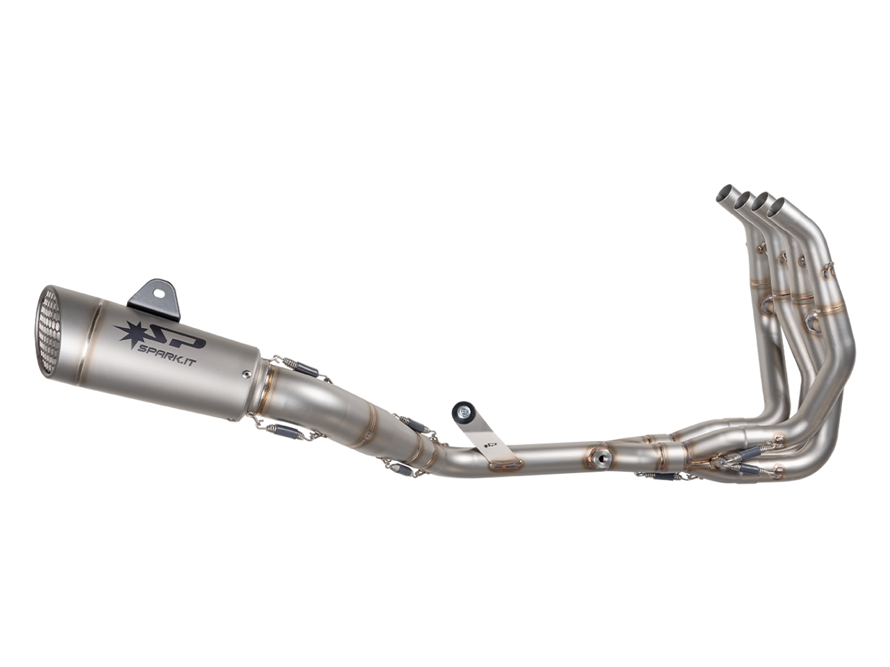 Spark Exhaust Kawasaki Ninja ZX-4RR "Grid-O" Full Exhaust System. This ZX-4RR full exhaust system has a short style titanium silencer, catalyst eliminating stainless mid-pipe and stainless racing header. Designed to maximize performance as noted by the extensively designed off the dyno 4-2-1 stainless manifold with 350mm diameter and tapers perfectly tuned for maximum output. Handcrafted in Italy, approximate weight 7.9 lbs (3.6 kg), sound level 115 db. (vs. stock @ 94.9 db). For perfect performance, throttle response and durability, ECU remapping is required. Option hangar to chassis for race use and included mount kit to keep the passenger footpegs. *DB Killer insert not available.