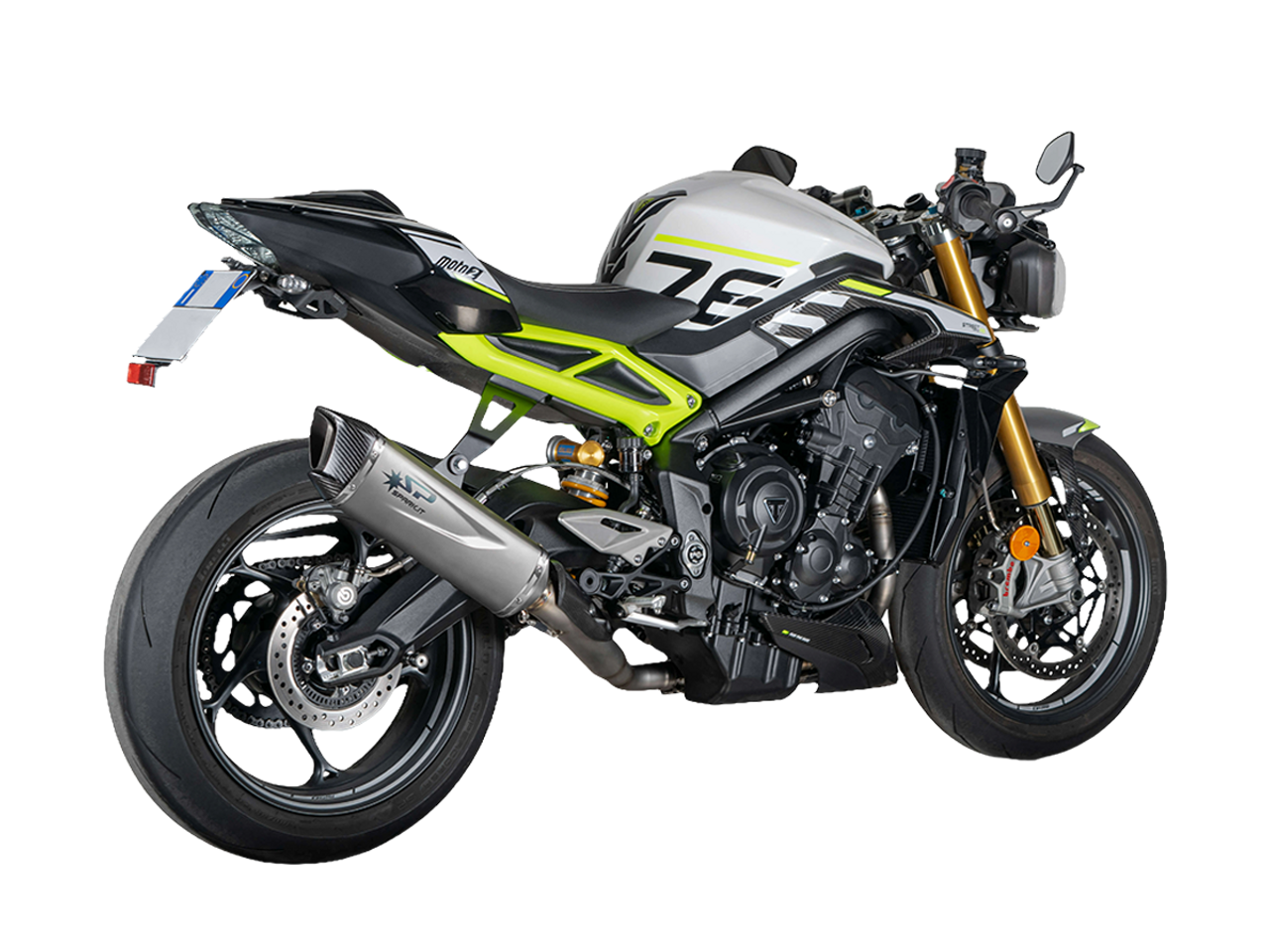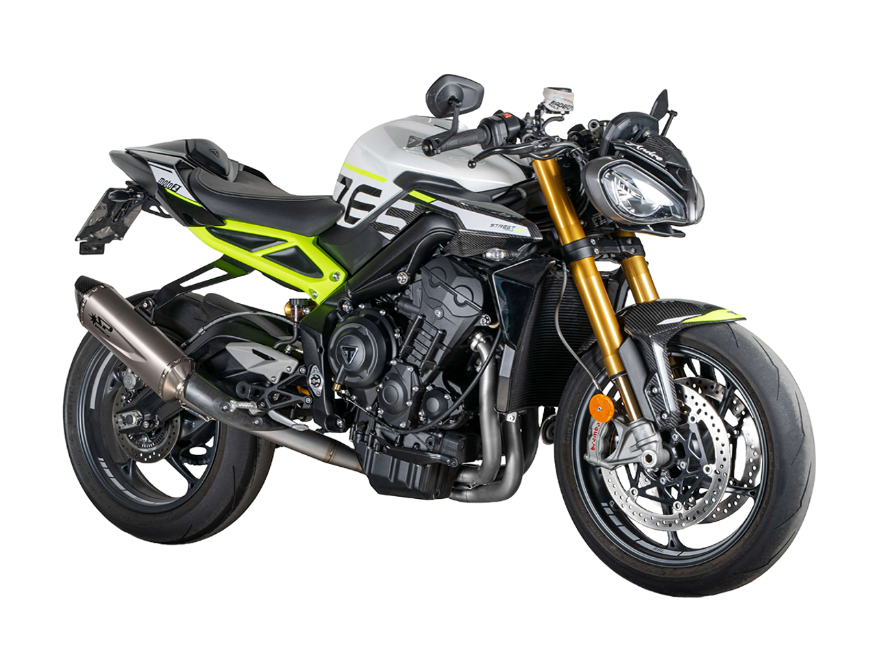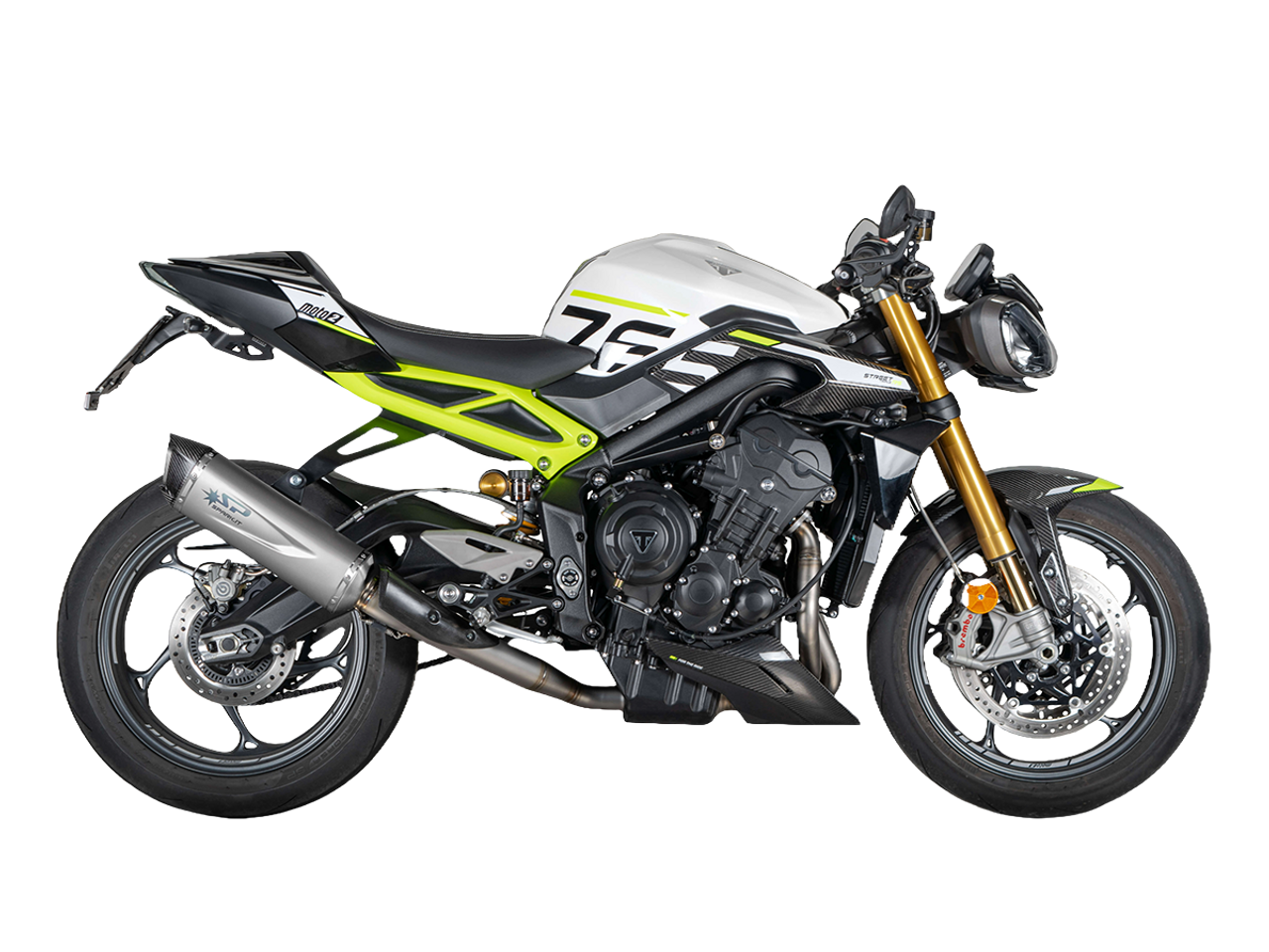 Spark Exhaust Triumph Street Triple 765 R/RS "Force Evo" Full Exhaust System. Titanium silencer with titanium link-pipe and stainless racing headers. Spark R&D has worked intensively on the new 3-cylinder engine by Triumph in Moto2. The experience gained on the racetrack allowed for the optimization of collectors' diameters and length of the English naked motorbike so as to get top performance. The exhaust has a deep sound that celebrates the Triumph's signature triple. Handcrafted in Italy. Ultra-light approximately 4.9 kg. Dyno Tested for maximum horsepower increase over stock, 113 db. Non-Homologated Racing Version for Maximum Performance. For perfect performance, throttle response and durability, ECU remapping is recommended. Includes SP-SKIT112 mounting hardware for all model years compatibility. *Does not include removable DB Killer.