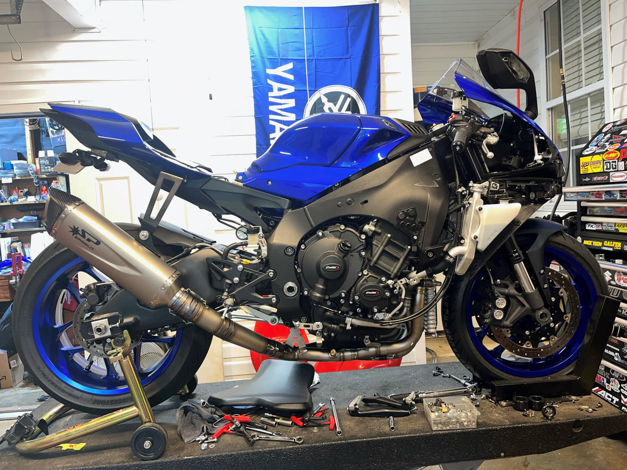 Spark Exhaust Yamaha R1 (2015+) "Force Evo" Titanium Full Exhaust System 65MM (WSBK Evolution). Constructed with a titanium silencer fitted with carbon ending, titanium mid-pipe and titanium racing header. The full system is the state-of-the-art product developed together with teams racing important championships all over the world. Besides the study of the collectors' best sizing for performance optimization, the technologies and the structural details of such product ensure top reliability. In fact, many teams have chosen Spark to face the Endurance World Championship. From the aesthetic point of view the segmented connecting tube is striking, with visible weldings enhancing the racing soul of the product. Weldings, segments and cones that are not merely a formal exercise but necessary solutions: after repeated bench tests such specific cones - out of the production standards - have been chosen as they allow the best torque. Handcrafted in Italy. Ultra lightweight approximately 3.6kg. Dyno Tested for maximum horsepower increase over stock, 102db. Non-Homologated Racing Version for Maximum Performance. For perfect performance, throttle response and durability, ECU remapping is recommended. *Does not include removable DB Killer.