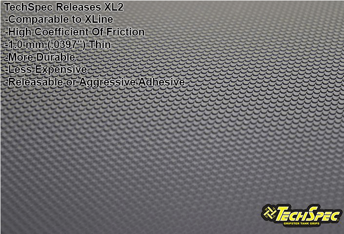 XL2 is a thin (.045"), medium durometer rubber skin with a raised dot pattern. The material is thin, lightweight, and has a high coefficient of friction comparable to that of TechSpec's XLine material. Yet less expensive and more durable.