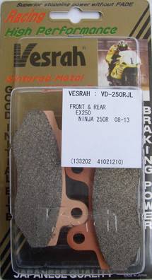 Vesrahs VD-250 RJL Brake Pad from Vesrah made specifically for Ninja 250R 08-13 (Front & Rear) but will also fit the Ninja 400, we advise to go with the 446ZZ or 446 RJL for the Ninja 400 as it is made specifically for that bike by vesrah.